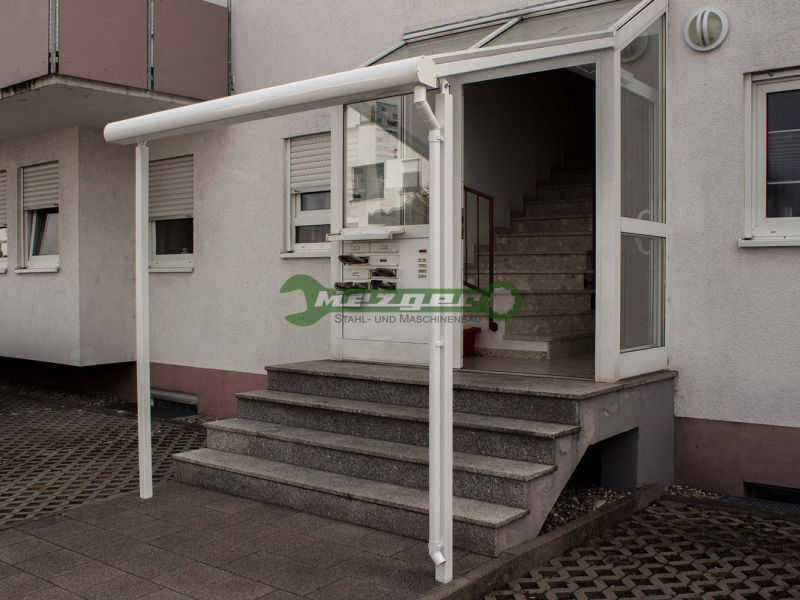 Überdachung Eingangsbereich mit seitlichem Windschutz aus Glas